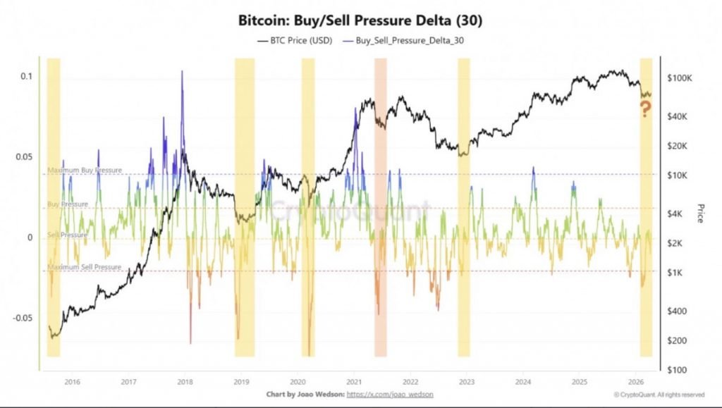 随后,随着供应减少,价格将逐渐恢复正常,回到绿色“卖压”区域。历史上,当delta值最终回到蓝色“买压”区域时,风险/回报比最不对称的机会就会出现,这表明需求正在真正回升,而不仅仅是市场趋于稳定。根据当前数据,比特币已经度过了最初的橙色上涨阶段,delta值正在上升,但尚未达到蓝色水平。历史上,确认的投降与需求重新出现之间的这段时间,为战略性资本部署提供了最佳条件。
