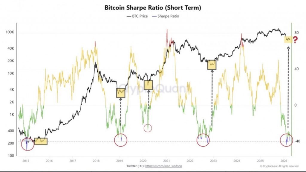 分析显示,短期夏普比率已大幅跌入负值区间,达到-40的阈值,这一水平历来与重要的买入时机相关。此前在2015年、2019年、2020年和2023年也曾出现过类似的极端值,而每次出现之后,资产估值都出现了显著的重估。历史图表显示,过去十年中每一次主要的积累阶段之前都出现了这种极端的负夏普比率,表明此时风险调整后的买入机会尤为强劲。目前,比特币的交易价格正处于这一具有历史意义的红色区域内,暗示着类似的积累潜力可能依然存在。